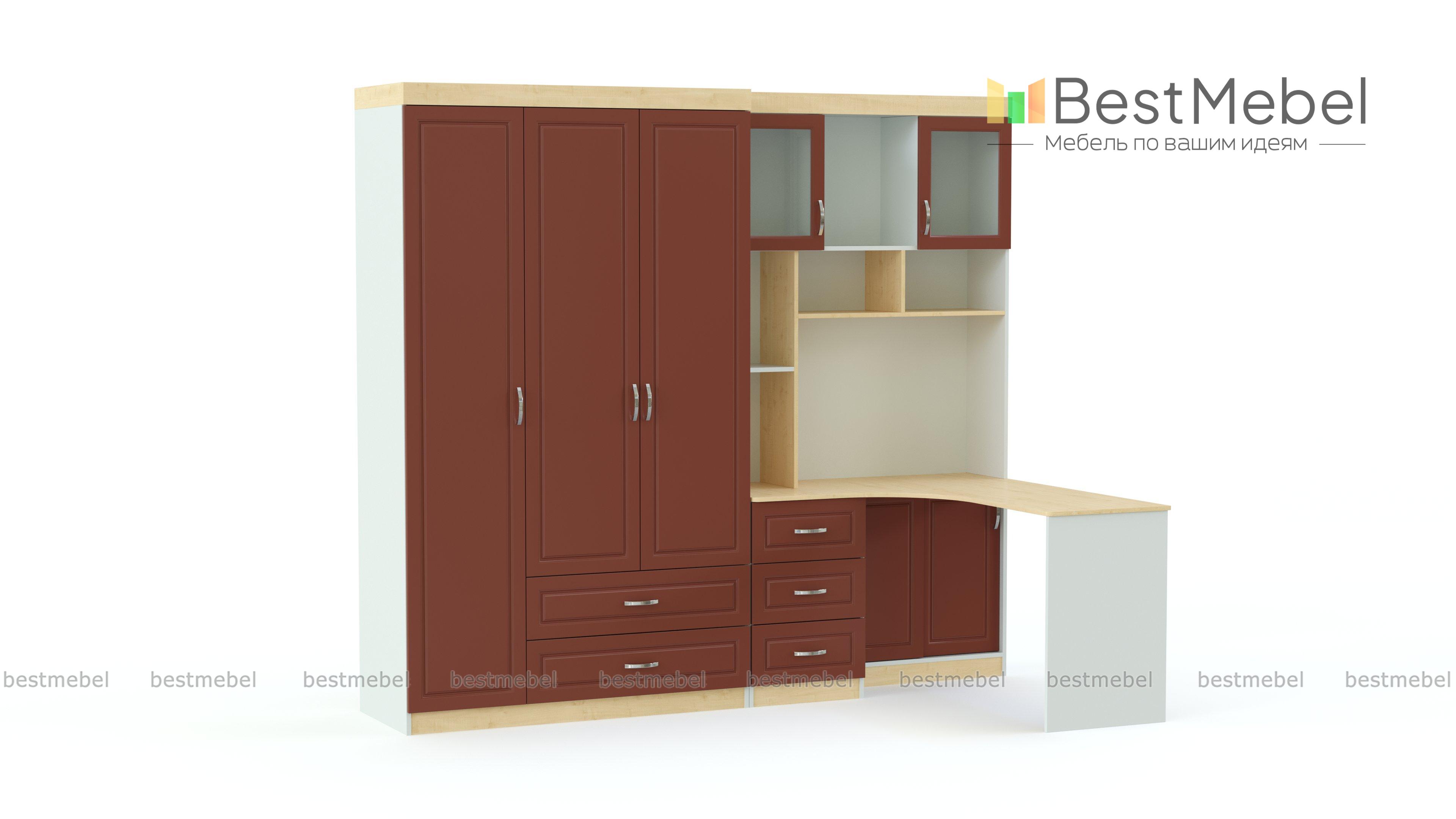 Шкаф со столом Классик 23 BMS – практичное решение для молодежной комнаты, позволяющее сэкономить пространство и компактно разместить гардероб и все необходимое для учебы. Многофункциональная композиция включает в себя трехдверный платяной шкаф с выдвижными ящиками в основании, две тумбы – с выдвижными ящиками и раздвижными дверцами, открытые и застекленные полки, а также угловую просторную столешницу. Актуальный вид модели с классическими фрезерованными фасадами придают древесные акценты. Купить шкаф со столом Классик 23 BMS приглашаем в наш интернет-магазин.