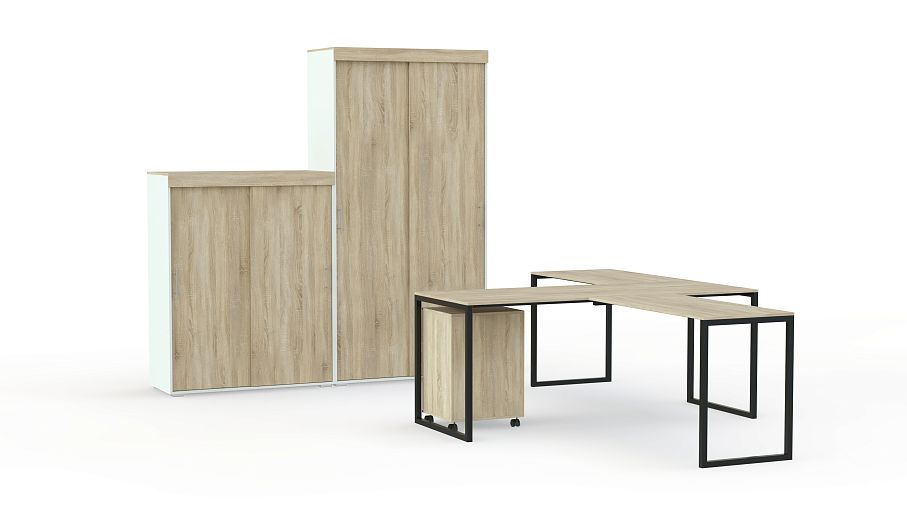 Офисный комплект мебели для тех, кто любит легкость и практичность во всем. Здесь нет громоздких столов, объемных широких стеллажей и тумб. Максимум комфорта и функциональности при минимальной занятости площади. Легкость и воздушность подчеркивает широкий выбор светлых цветов. Хотя для любителей темных оттенков есть насыщенный и притягательный черный.