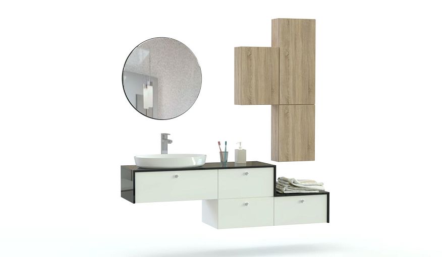Мебель для ванной Амели 2 BMS сочетает в оформлении матовые и глянцевые поверхности, нейтральные и яркие оттенки. Оригинальная композиция включает в себя широкую ступенчатую тумбу под раковину-чашу, фигурное зеркало и распашные навесные шкафчики с глухими фасадами. Подвесная конструкция облегчает уборку в помещении, оставляя свободным пространство под тумбой. Купить мебель для ванной Амели 2 BMS приглашаем в наш интернет-магазин с возможностью подбора фурнитуры и цвета по каталогу.