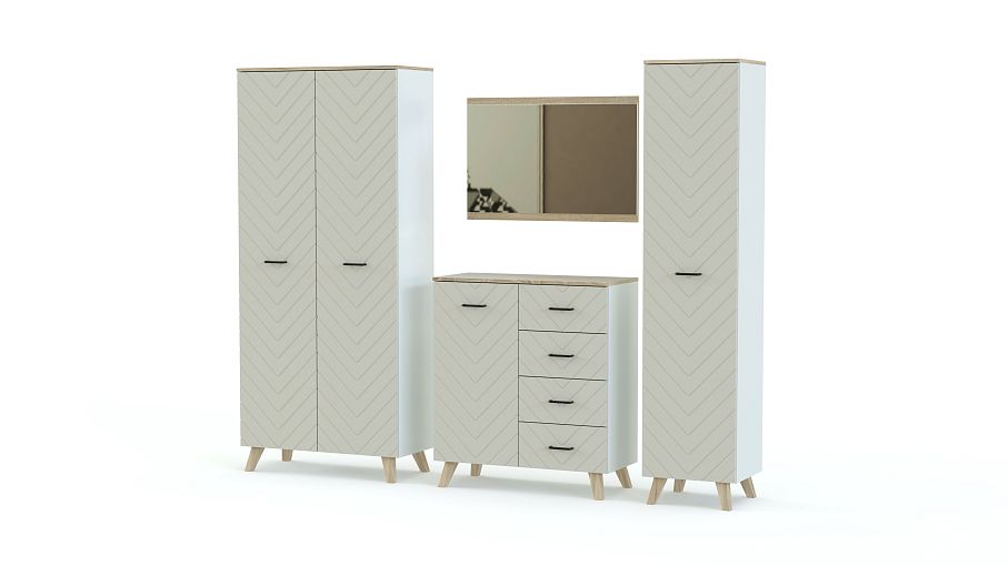 Прихожая Эста Нео 17 BMS – это простые формы, нейтральные цвета и практичная конструкция из отдельных модулей. Композиция для просторного помещения включает в себя двухдверный платяной шкаф, пенал, комбинированную тумбу с распашным отделением и четырьмя выдвижными ящиками и навесное зеркало. Фрезеровка на фасадах и высокие скошенные ножки выполнены в скандинавском стиле, наполняя пространство уютом. Купить прихожую Эста Нео 17 BMS вы сможете в нашем интернет-магазине, подобрав оптимальные размеры.