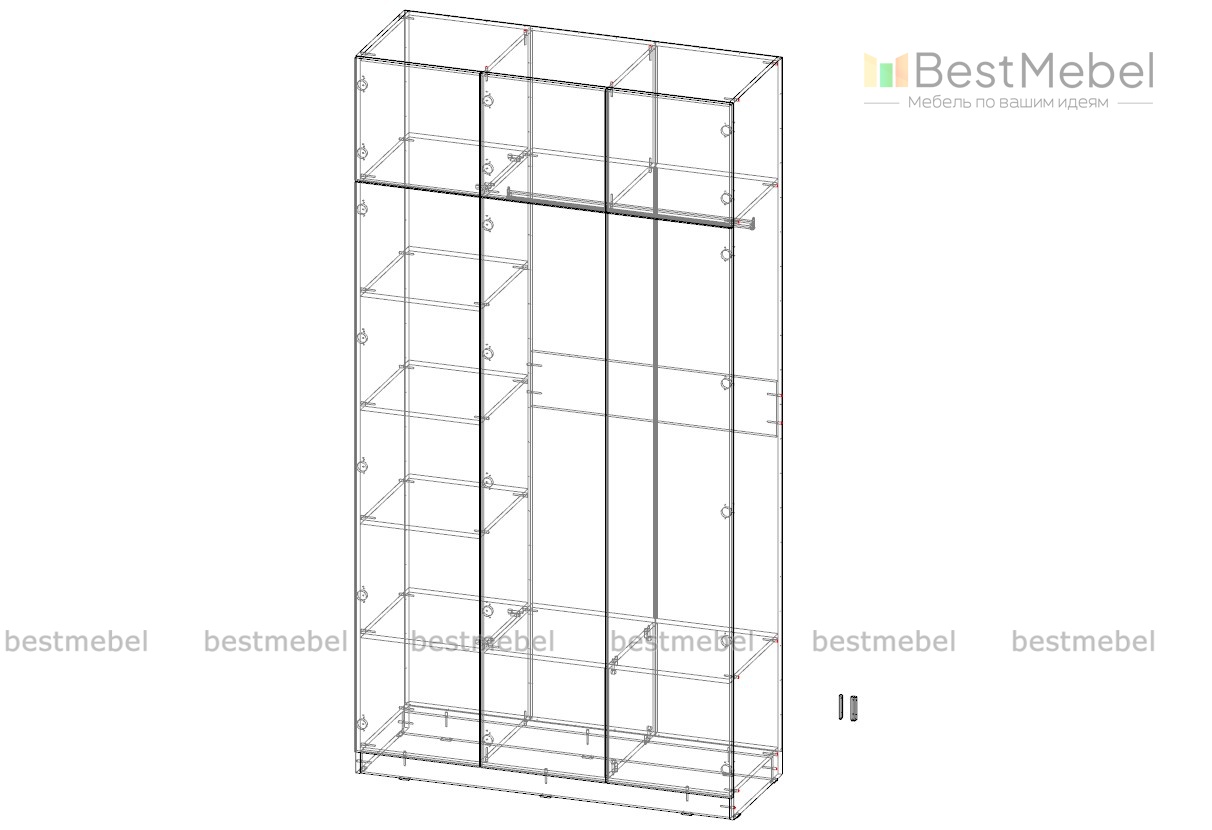 Современный дизайн и стильная фурнитура придают шкафу изысканный вид, делая его не только функциональной, но и декоративной частью интерьера.Шкаф оснащен просторными полками, штангой для вешалок, что обеспечивает удобную организацию пространства и позволяет легко поддерживать порядок.Шкаф без ручек, антресоль на толкателях, ручки можно выбрать отдельно.