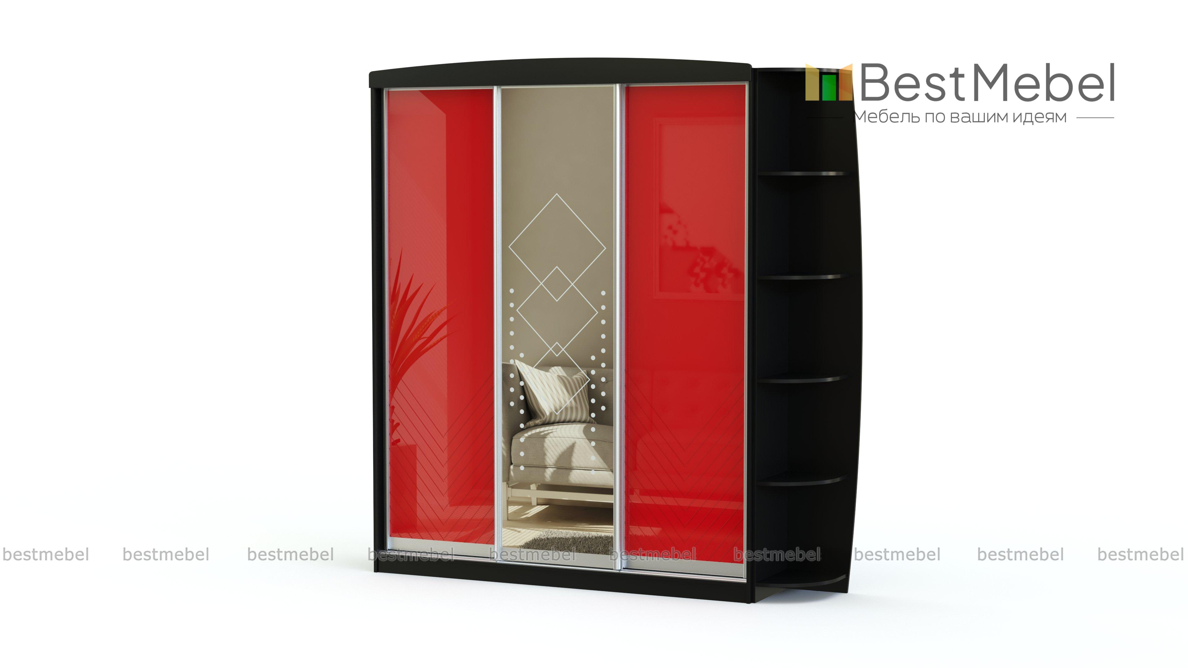Шкаф-купе Куб BMS с тремя створками и дополнительным открытым стеллажом с полками отлично впишется в просторную прихожую или небольшую квартиру-студию. Комбинированное оформление фасада шкафа позволяет гармонично вписать его в интерьер помещения, не утяжеляя его. Центральная створка по умолчанию декорируется цельным зеркалом с пескоструйным рисунком. Внутреннее наполнение шкафа может быть подобрано в индивидуальном порядке и включать выдвижные ящики, штанги для вешалок и полки.