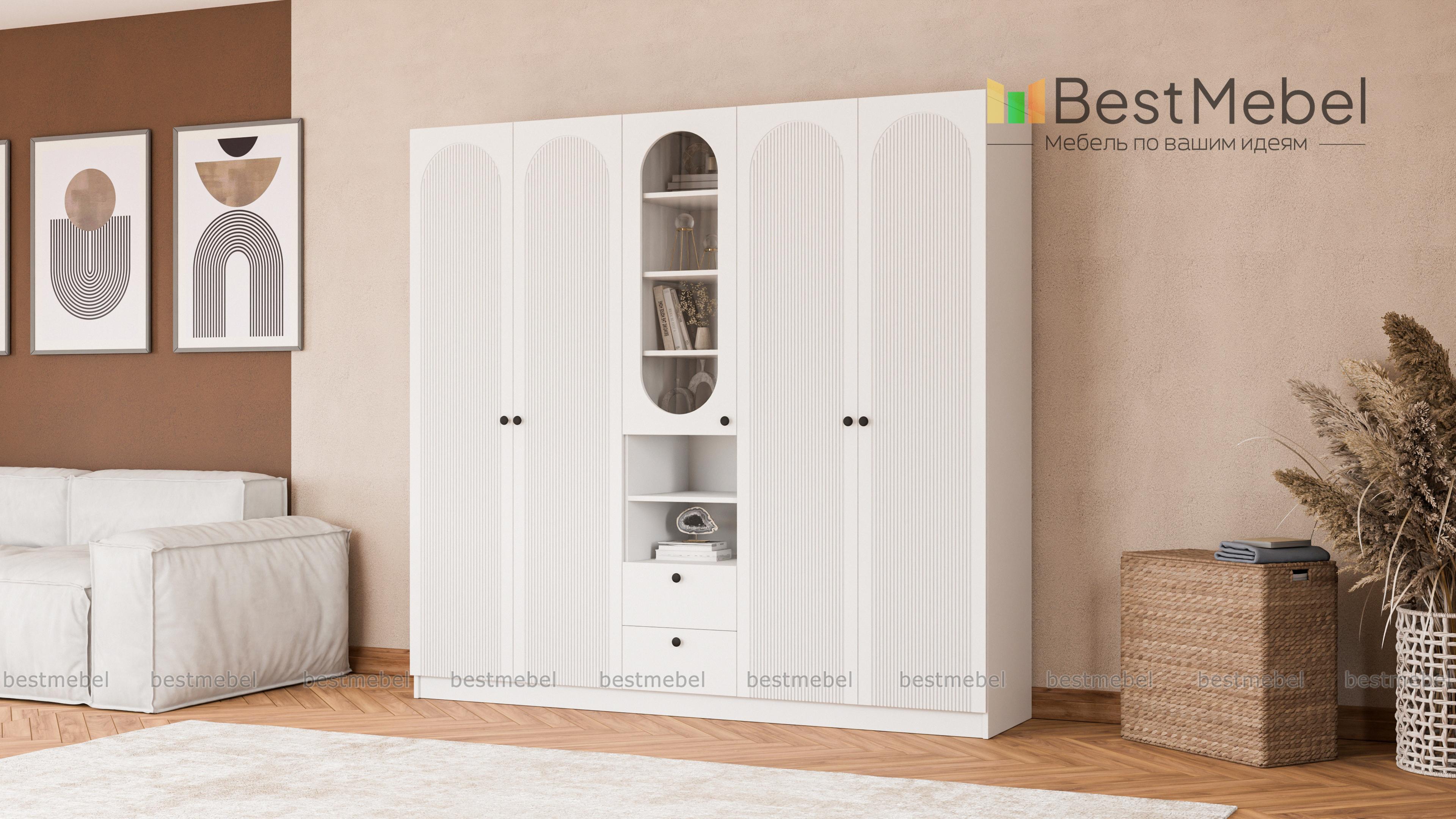 Шкаф распашной Рене 15 BMS — это композиция для гостиной или спальни, объединившая двухдверные отделения для одежды и комбинированную с ящиками и полками витрину. В одном месте будут компактно храниться предметы гардероба, важные мелочи, книги и еще многое другое. Фрезеровка на дверцах шкафа, выполненных из МДФ, повторяет форму изящных вырезов витрин. Купить шкаф распашной Рене 15 BMS, изготовленный по вашим размерам из качественных материалов, приглашаем в наш интернет-магазин.