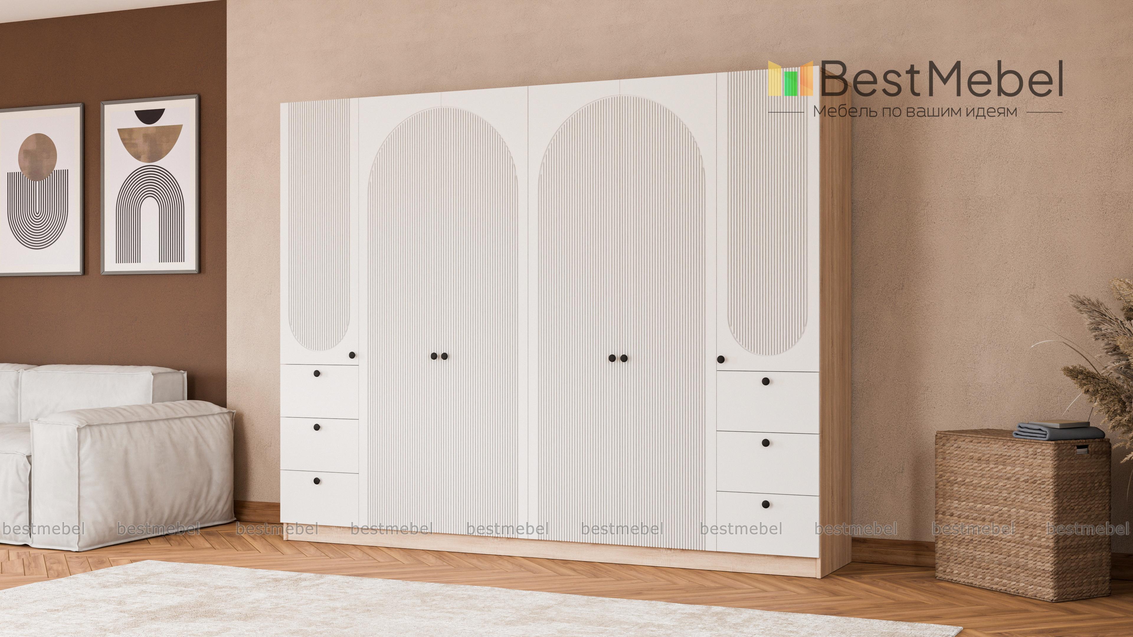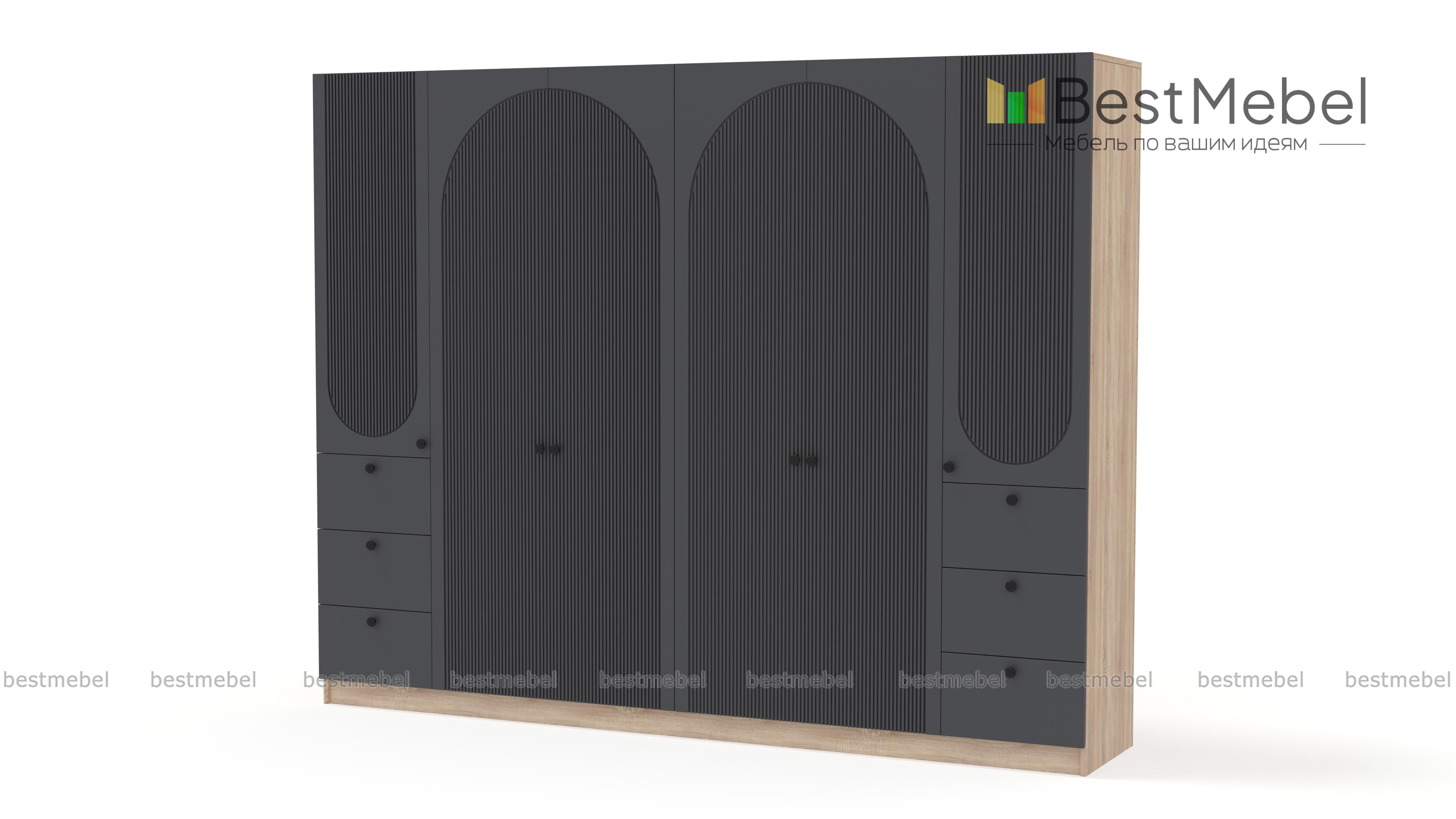 Шкаф распашной Вивьен 19 BMS с двумя платяными отделениями и двумя комбинированными легко и удобно разместит семейный гардероб. Габаритная конструкция для просторной спальни или прихожей оборудована штангами, бельевыми полками и шестью выдвижными ящиками. На фасаде из МДФ актуального оттенка — оригинальная геометричная фрезеровка и контрастные круглые ручки. Купить шкаф распашной Вивьен 19 BMS с изготовлением по индивидуальным размерам вы сможете на сайте нашего интернет-магазина.