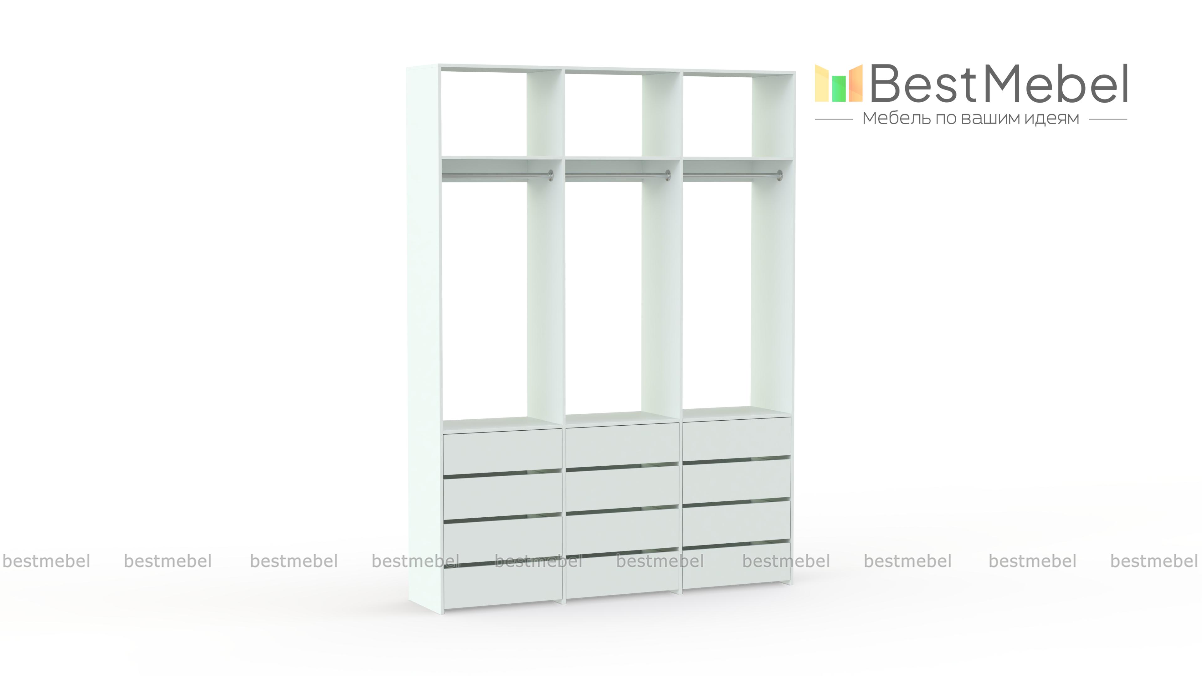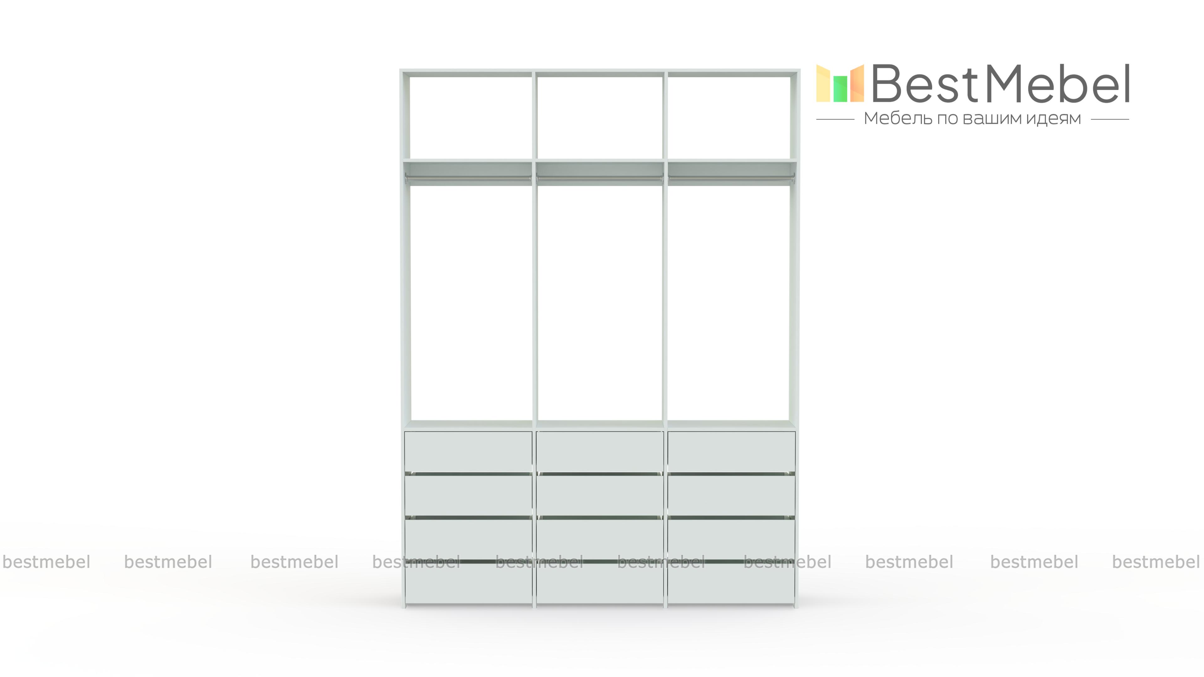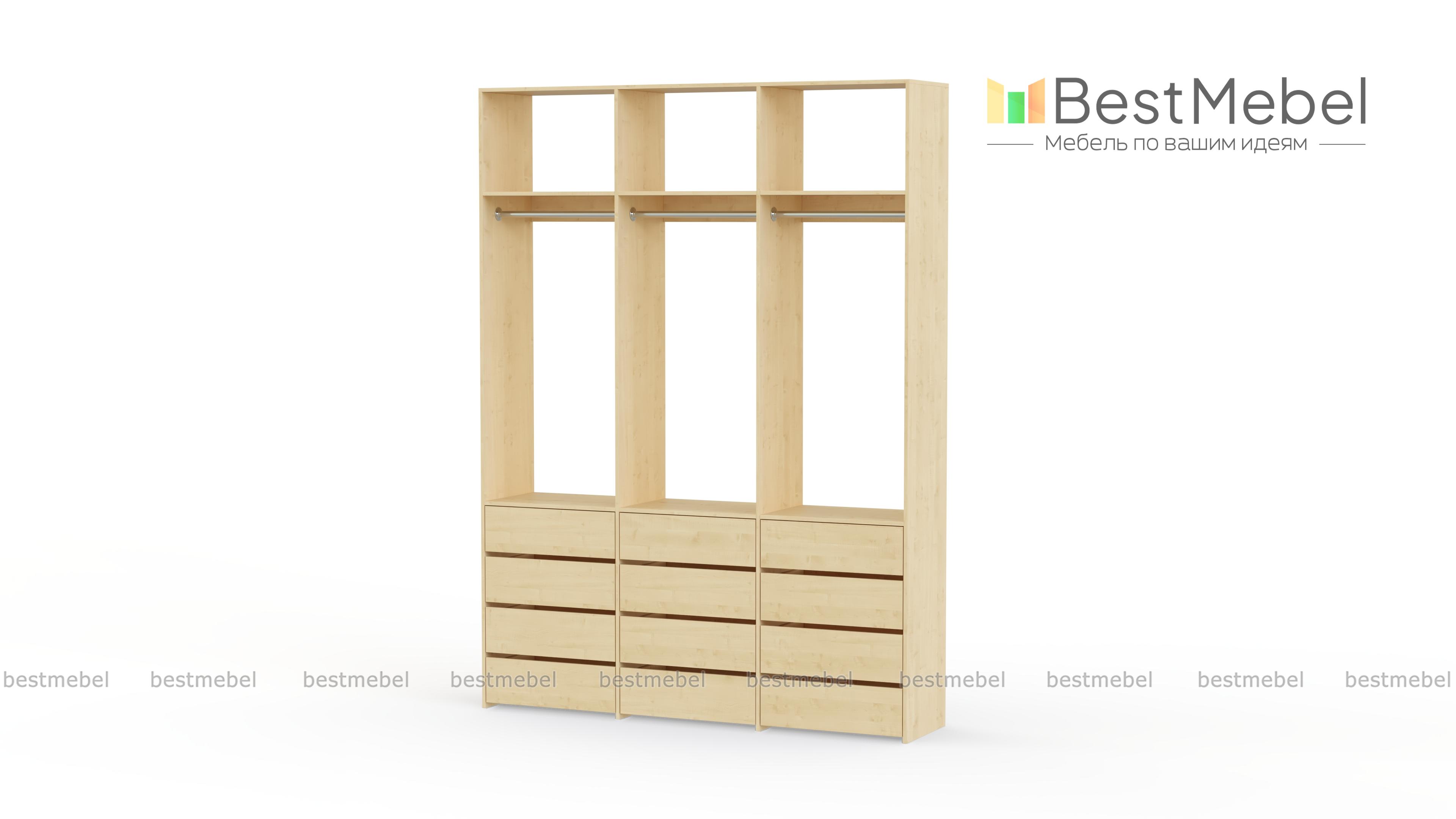 Стеллаж для одежды Мирта 47 BMS выполнен из прочной ламинированной ДСП и включает в себя три секции. В нижней части располагаются выдвижные ящики для текстиля и аксессуаров, средняя занята платяными штангами, а верхняя — полками для несезонных вещей. Минималистичный дизайн позволяет стеллажу легко вписаться в существующий интерьер. Купить стеллаж для одежды Мирта 47 BMS, изготовленный по индивидуальным размерам, вы сможете в нашем интернет-магазине.