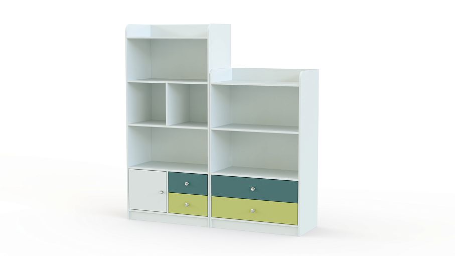 Стеллаж Радуга 4 BMS включает в себя два модуля – низкий, оборудованный открытыми полками и выдвижными ящиками, и высокий, дополненный распашным отделением. Практичная композиция позволит разместить любимые книги ребенка, игрушки, принадлежности для творчества и многое другое. Гармонично впишется в интерьер современной детской сочетание нейтрального белого с цветными матовыми вставками. Купить стеллаж Радуга 4 BMS приглашаем в наш интернет-магазин по доступной цене.