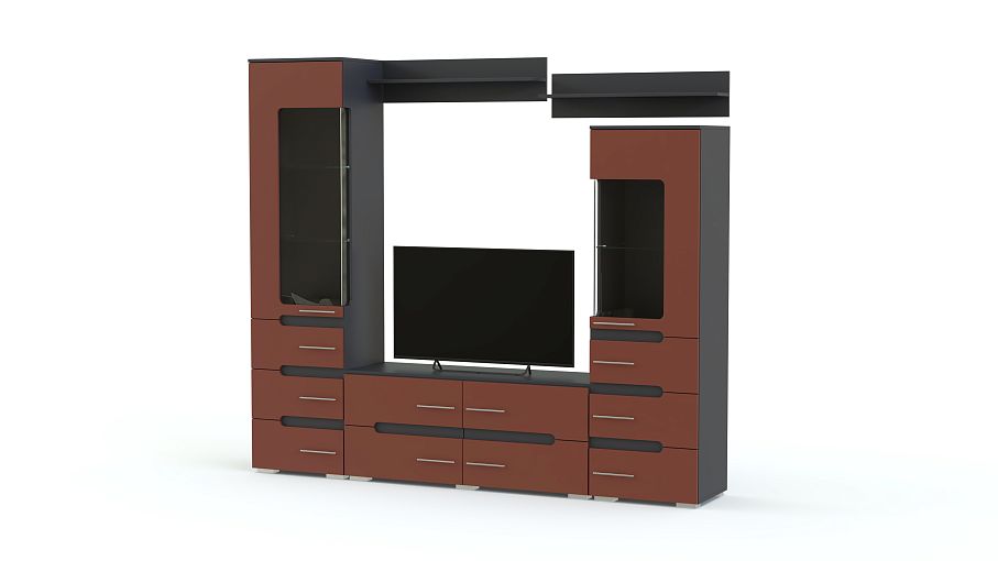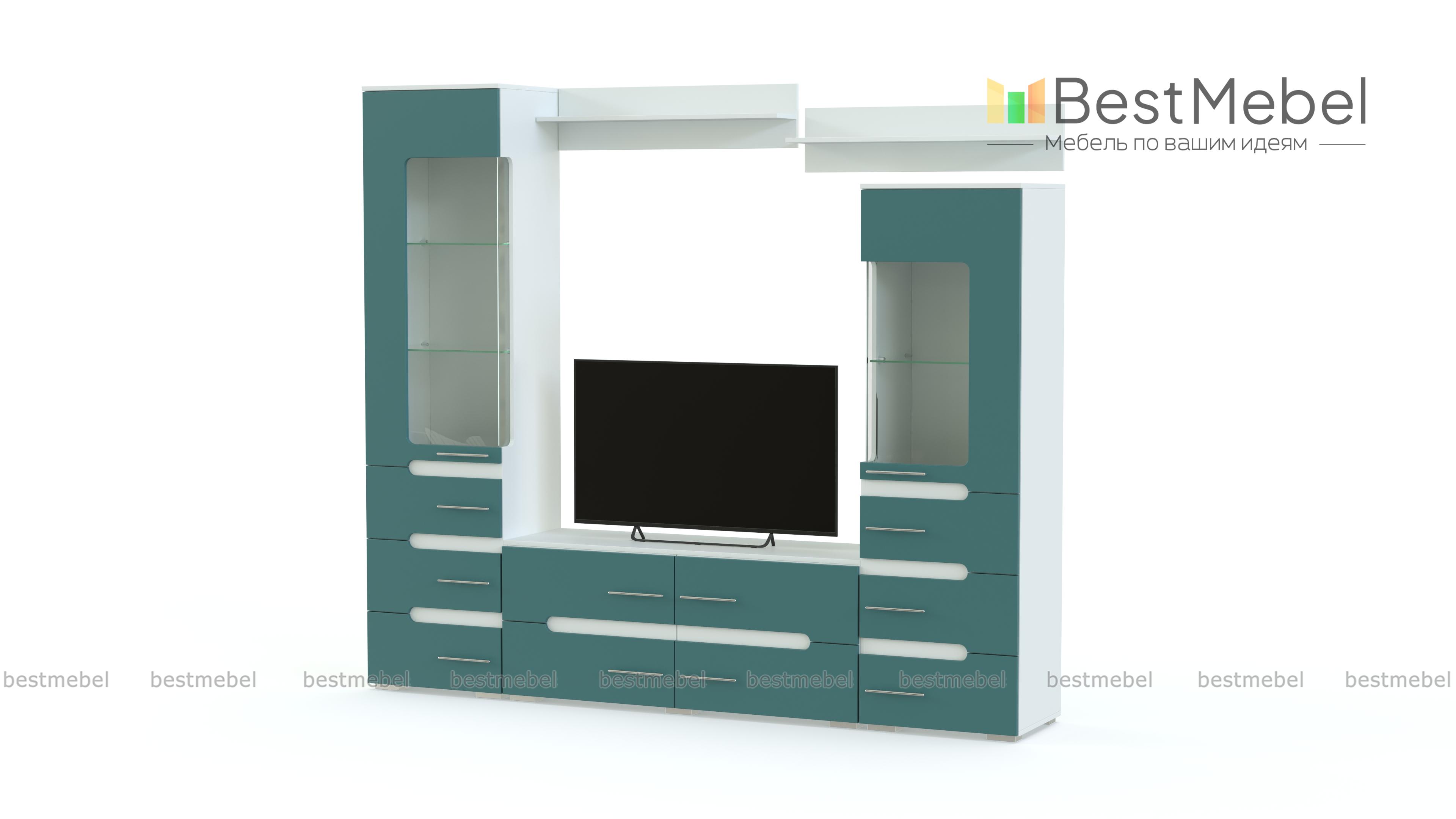 Гостиная Hi-tech 4 BMS представляет собой современный вариант стенки-горки и будет гармонично смотреться в помещениях стиля хай-тек. Яркая и функциональная, гостиная включает в себя две разноуровневые витрины с выдвижными ящиками в основании, тумбу под ТВ и навесные открытые полки. Матовые фасады декорированы контрастными скругленными вырезами и хромированными ручками-рейлингами. Купить гостиную Hi-tech 4 BMS, подобрав оптимальное сочетание из широкой гаммы оттенков для корпуса и фасадов, приглашаем в наш интернет-магазин.