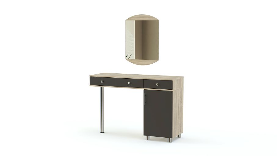 Туалетный столик Мелисса СТ 116 BMS отличается вместительностью и функциональностью, но при этом визуальной легкостью. Модель оборудована широкой столешницей, тремя выдвижными ящиками и распашным отделением с полкой, опираясь одной стороной на устойчивую хромированную опору. Элегантный вид придают столику матовые фасады и эффектное цветовое сочетание древесных оттенков. Купить туалетный столик Мелисса СТ 116 BMS по привлекательной цене приглашаем в наш интернет-магазин.