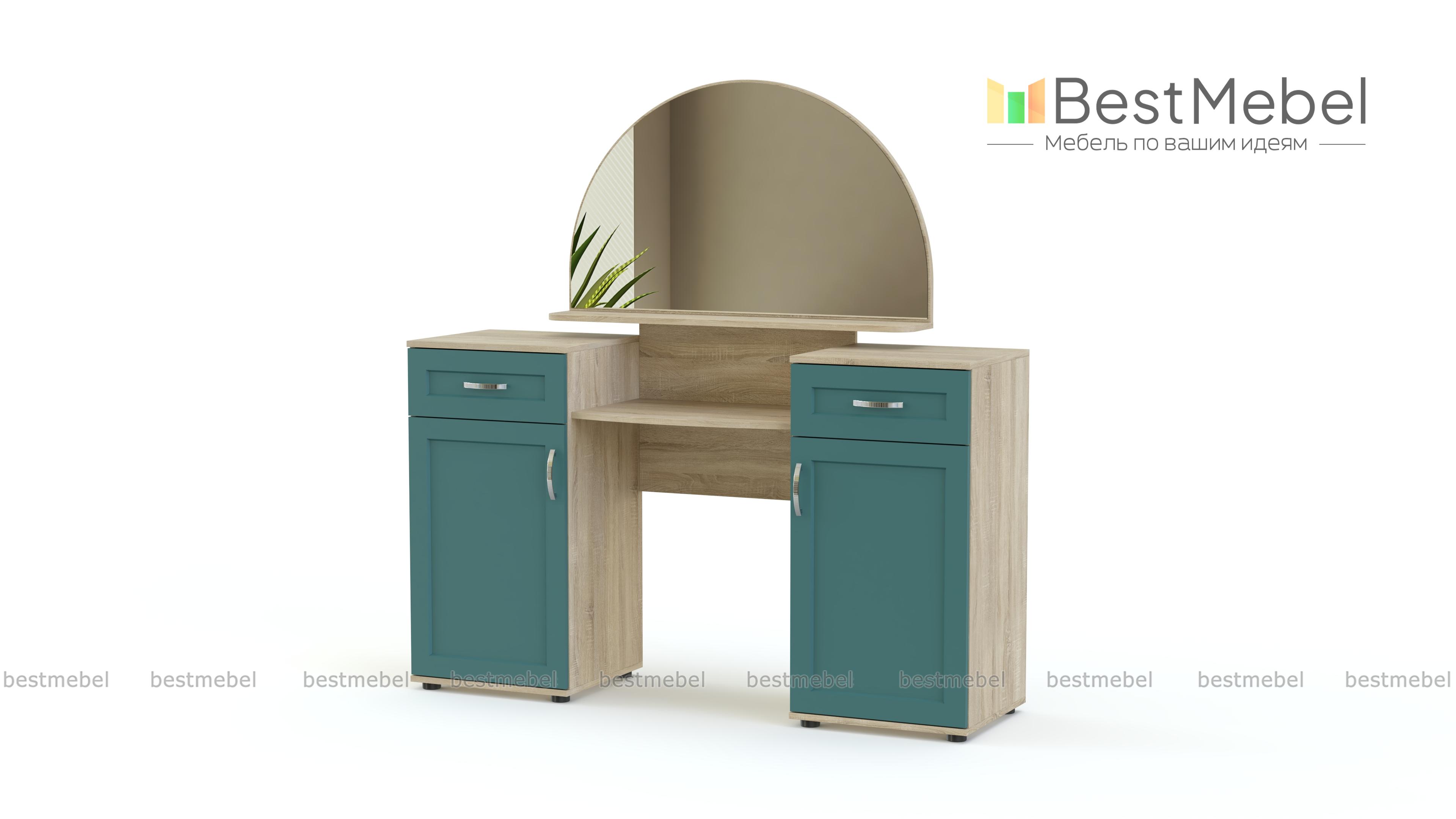 В этой модели элегантность стиля модерн сочетается с функциональностью современной вещи. Полукруглое зеркало, на полке которого будут оригинально смотреться парфюмерные флаконы, гармонирует со скругленной полочкой – столешницей. По бокам расположены вместительные тумбы с распашными дверцами и выдвижными ящиками для косметики и украшений. Фасады просто декорированы, фурнитура неброская и стильная. Приобрести туалетный столик Ника-Люкс BMS в подходящем цвете вы сможете у нас в интернет – магазине.