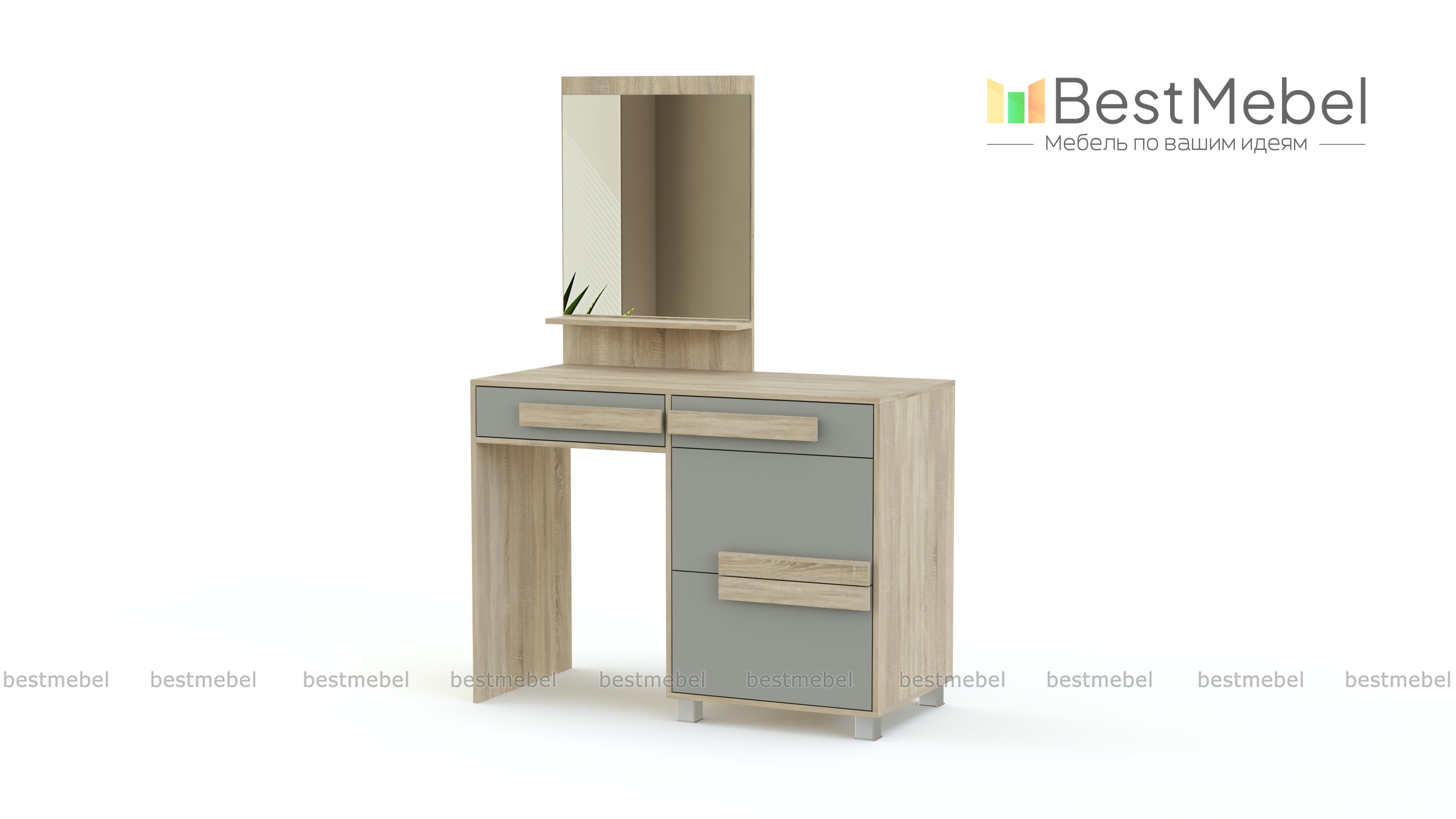 Туалетный столик СТ-5 Арт 155 BMS – стильный предмет интерьера для современной спальни. Закрепленное на столешнице зеркало дополнено узкой полочкой для мелочей. Также модель оснащена выдвижным ящиком и боковой тумбой для хранения уходовых средств и бумаг. Интересно смотрится этот простой функциональный столик за счет необычной отделки фасадов, модной цветовой гаммы и высоких ножек тумбы. Доступный по цене, туалетный столик СТ-5 Арт 155 BMS будет отличным приобретением для дополнения спального гарнитура или установки в прихожей.