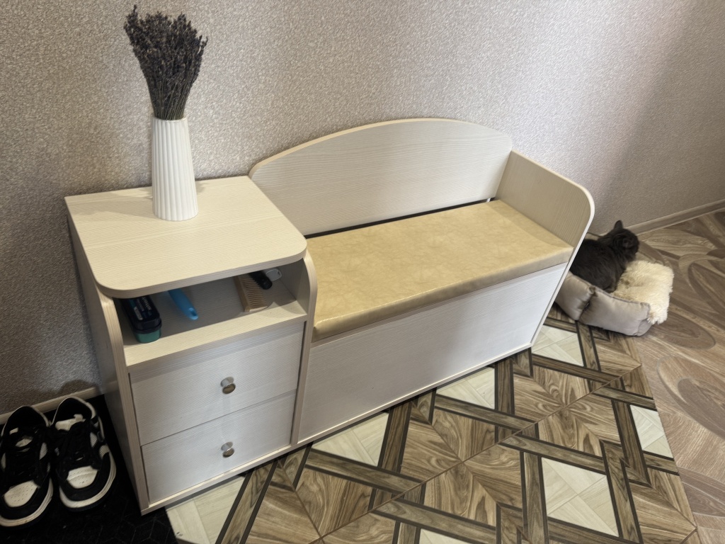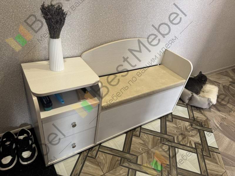 Тумба для обуви классная.Очень симпатично смотрится. Удобная и вместительная.Сидушка мягкая экокожа светлая.