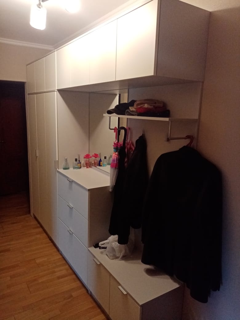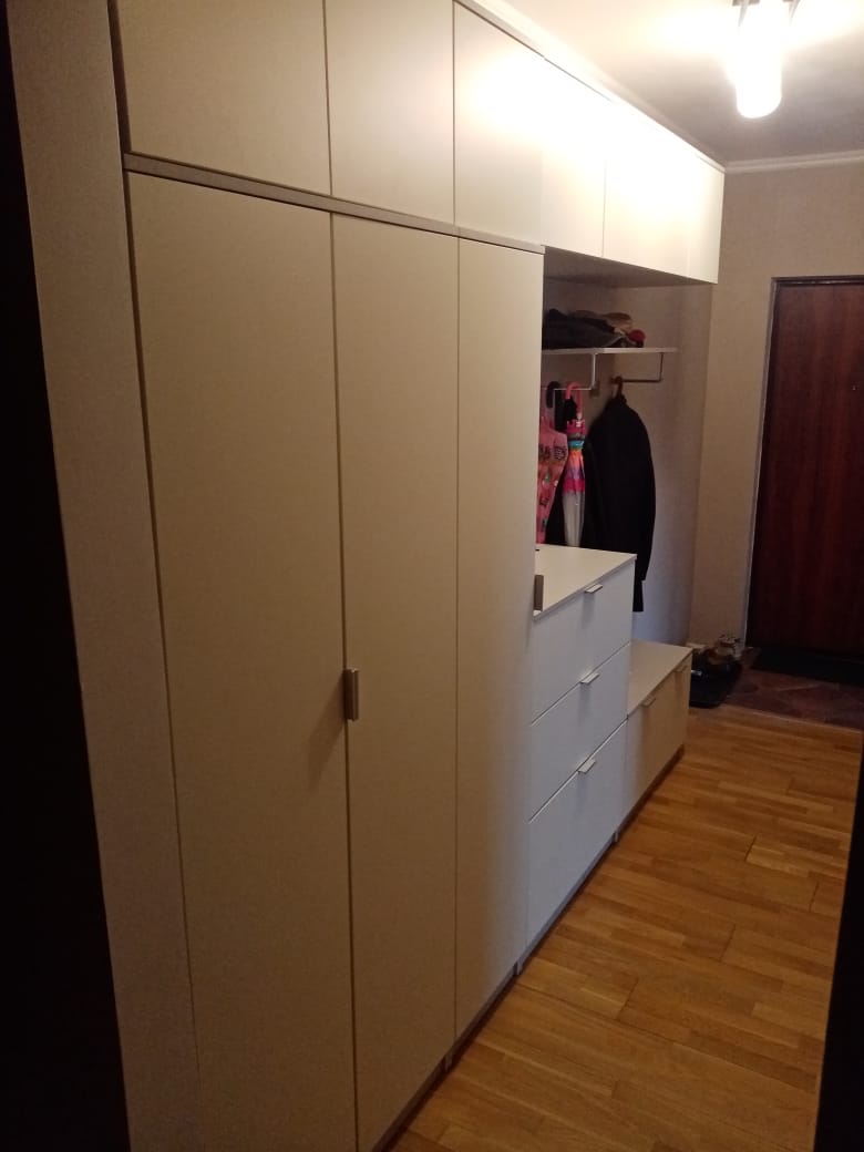 Заказывала прихожую по своим размерам, нужна была длинная и узкая. 2800*400*2300. Добавили дополнительный шкаф колонку в стандартную комплектацию и убрали зеркало с двери (у нас узкий коридор, зеркало там не удобное решение). Цвета выбрала серый на корпус и крем гладкий на фасады. Исполнение понравилось, единственное долго согласовывали эскиз, заказ сделала 5 числа 19 уже привезли. Прихожая функциональная, верхние антресоли вместительные и удобные(открываются вверх, учитывайте при планировке), много места для размещения. Петли с доводчиками взяла, удобные очень, дверцы не хлопают. Обувницу тоже изменили, сделали две глубоких выдвижных полки, а нижняя для обуви осталась. Мне очень нравится и внешний вид и функционал, зеркало широкое, хоть и не в полный рост, но нам это не нужно было. Только ручки острые оказались, хоть и немного торчат, но пару раз уже ударялась о них. В целом можно было без них делать, выглядело бы еще круче
