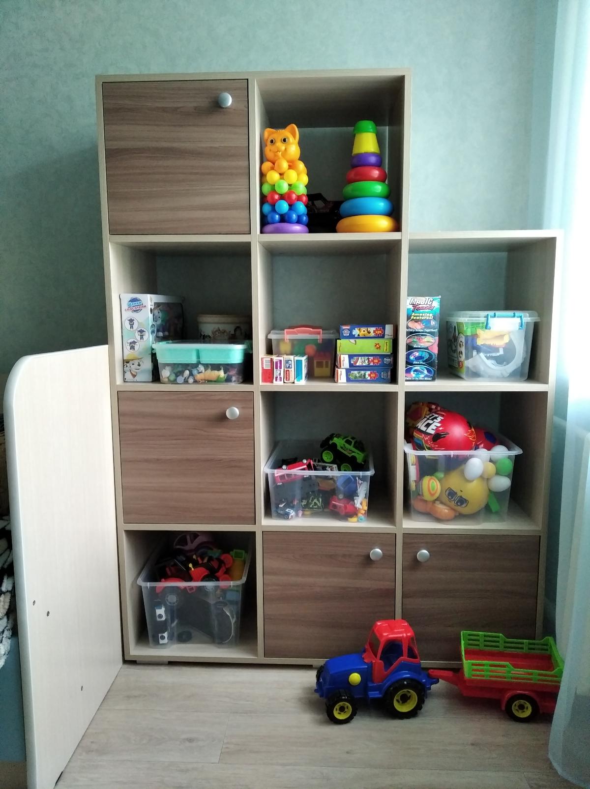 Покупали стеллаж в детскую под игрушки. Стеллаж очень хороший, но есть один недостаток, который для меня очень существенный. Углы у стеллажа и у дверок очень острые, и если на углы стеллажа купила силиконовые накладки, то с острыми дверцами пока не придумали что сделать.
