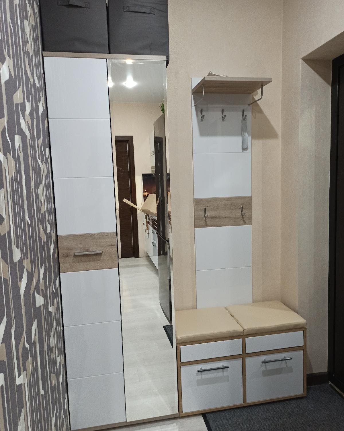 Обратите внимание, тумба немного отличается визуально от заявленной. Верхние ящики открываются от нажатия, сидушка не поднимается. Ручки тоже не такие как на картинке. Покупали тумбу, что бы максимально подходила по цвету и размеру к нашей прихожей. Собирали сами 2 дня, не все пропилы совпадают. Выглядит красиво, сидушка мягкая. Удобно, что есть 2 комодных ящика, в одном храним губки и салфетки для обуви, в другом перчатки и детские шапки. Цвет брали дуб Сомона и белый глянец, цвет дуба немного теплее, чем наша стенка, но если не приглядываться, то не сильно видно. Нигде не могли найти тумбу нашего цвета и шириной 80см, в этом магазине можно самим выбрать размеры. Берём здесь мебель уже в третий раз. Всем советую!