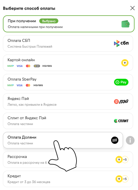 Чтобы оформить покупку с помощью «Долями Плюс», при оплате укажите «Оплата Долями». Если вам доступна рассрочка, на экране появятся дополнительные сроки оплаты на 3, 6 или 10 месяцев. Доступный срок по «Долями Плюс» зависит от суммы покупки и вашей кредитной истории.